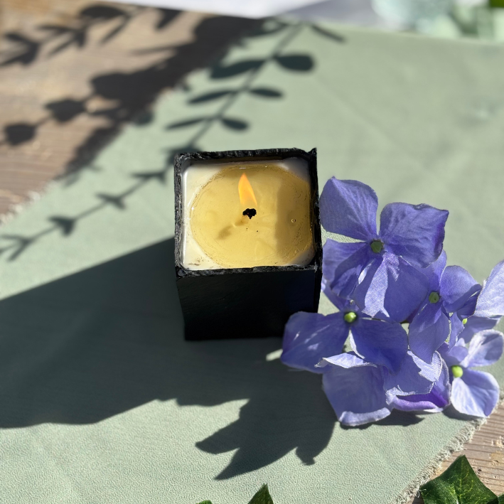 Chaque bougie Éternelle est une création unique, façonnée entièrement à la main en France. La cire végétale de soja, le parfum de Grasse garanti sans CMR ni phtalates, la mèche en coton et la pyrite délicatement intégrée en font une expérience sensorielle rare. L’ardoise, taillée à la main par nos soins, rend chaque bougie véritablement unique : aucune n’est identique. Nous sommes fiers d’être les seuls à proposer ce savoir-faire artisanal.
